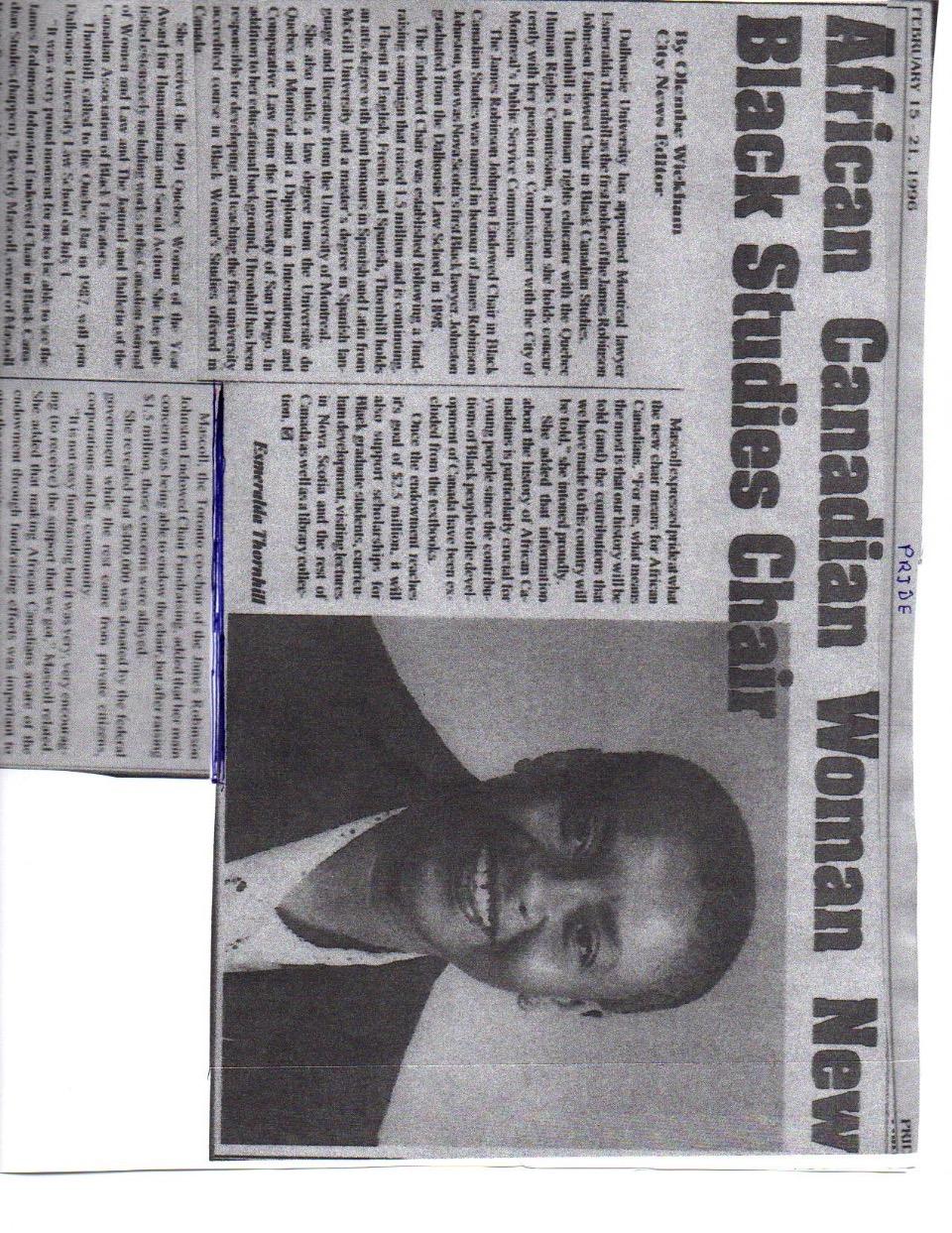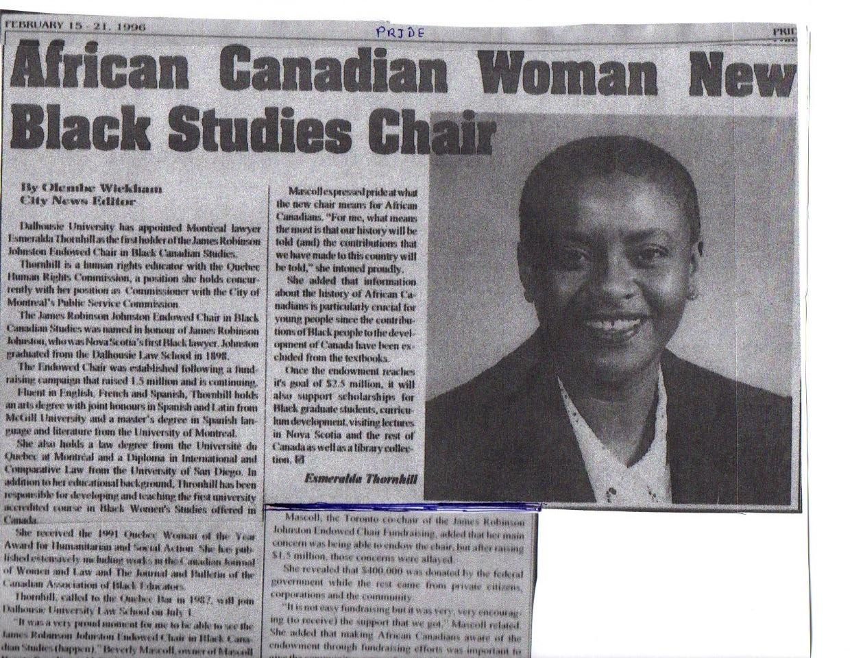 “Montrealer Esmeralda M.A. Thornhill is a very special and distinguished woman”. Community Contact, Montreal 1997